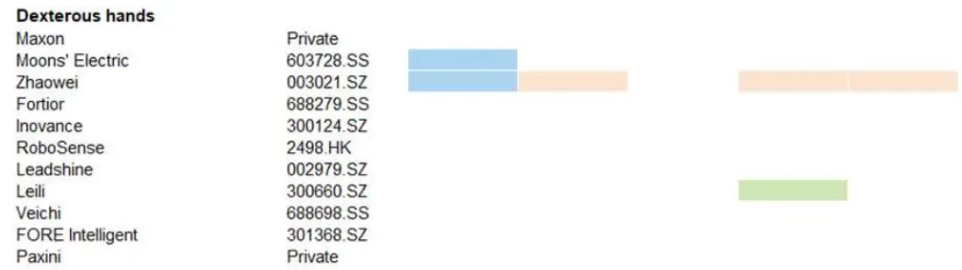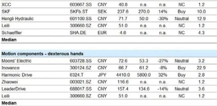 鸣志电器(Moons’ Electric)和兆威机电(003021.SZ,未覆盖) 都在为灵巧手开发无铁芯电机,并试图交付包括编码器、齿轮、传感器等在内的完整手部模块。该领域的另一个潜在参与者是英洛华(Inovance),此前该公司宣布他们将开展灵巧手方面的研发。我们认为英洛华凭借其在伺服电机技术方面的雄厚基础,在开发此类产品上具有潜力。
