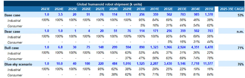 根据我们与投资者的交流,市场目前的共识似乎是,鉴于在制造业、服务业、养老护理等领域巨大的需求潜力,全球人形机器人最终能够实现 100 万台的出货量;而且只要实现这一出货量的功能和时间符合市场需求,预期水平就会有所不同(高盛预计在基本情景下为 2034 - 2035 年,在乐观情景 / 最佳情景下为 2030 - 2031 年 / 2028 - 2029 年)。