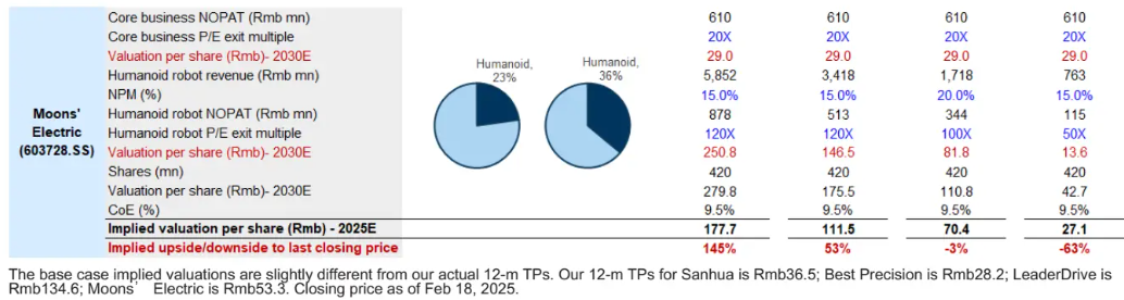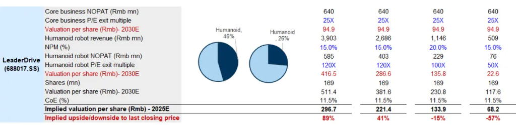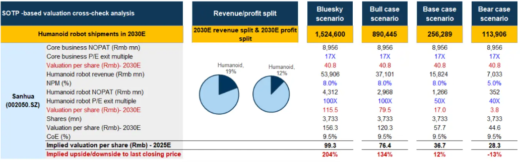 因此,我们采用长期估值(将 2030 年的预期折现至 2025 年)来得出目标价格。2030 年基于分部加总法(SOTP)的估值(按机器人业务和核心业务划分),在不同情景下进行分析并折现至 2025 年。分别如下:
