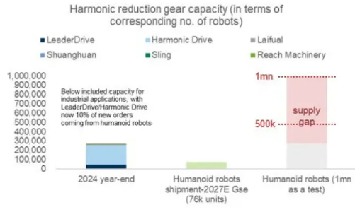 根据高盛预计,到 2027 年,谐波减速机的产能有望满足人形机器人的出货需求,但在人形机器人出货量达到 50 万至 100 万台的情况下,会出现显著的供需缺口。