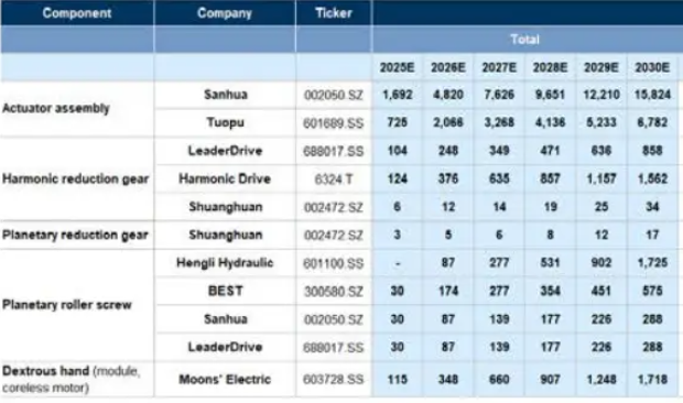不同的零部件公司在不同规格的人形机器人领域中具有不同的产品定位和机会,根据它们在全球人形机器人供应链中成为供应商的概率(高 / 中 / 低) 因此我们预计它们在人形机器人供应链中的全球市场份额会有所不同,并据此得出我们对所覆盖的各公司机器人业务板块的收入预测。