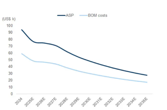 高盛对全球人形机器人平均销售价格(ASP)和物料清单(BOM)成本的预测(2024 - 2035 年预估)