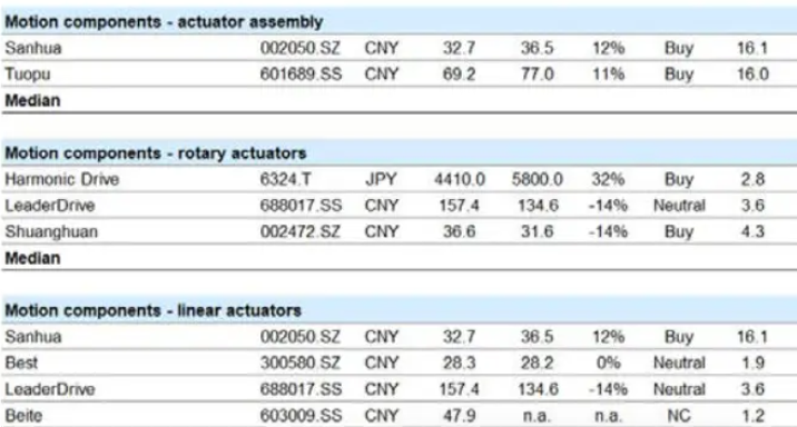 目标价格风险与估值方法:我们给予的12个月目标价为134.6元人民币,基于2030年45倍的市盈率,按11.5%的资本成本折现至2025年预期值。上行风险包括:(1)人形机器人的量产速度和/或技术进步速度快于预期;(2)进入关键机器人客户(尤其是外国品牌)的速度快于预期。下行风险包括:(1)国内工业/协作机器人需求低于预期;(2)拓展海外和本土品牌市场的竞争比预期更激烈。