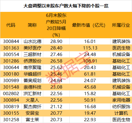 据证券时报•数据宝统计,截至7月5日,有360多只个股同时披露6月末及5月20日的股东户数,其中101股6月末的股东户数较5月20日降幅超5%,山水比德、美好医疗、三超新材等13股股东户数降幅超20%。