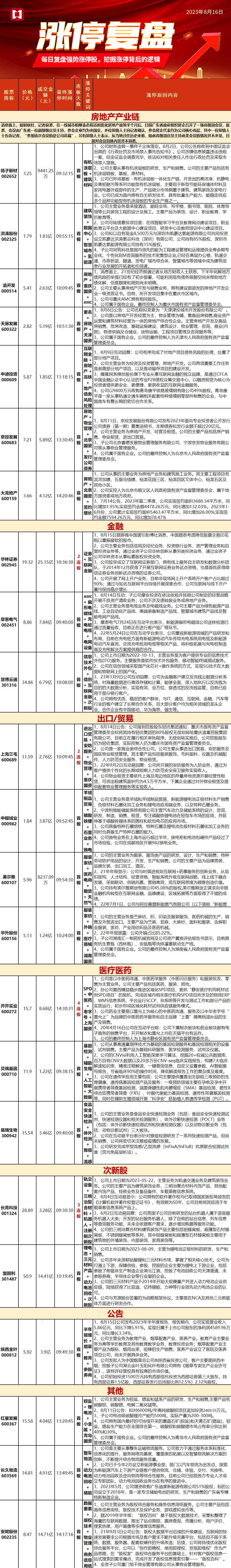 【8月16日】今日周三,今日23股涨停,12股炸板,封板率为66%,盘面上,收涨个股1050只,收跌个股3847只;板块方面,房地产、券商、新型城镇化、新冠检测等板块涨幅居前,液冷服务器、云办公、供销社、ChatGPT等板块跌幅居前。