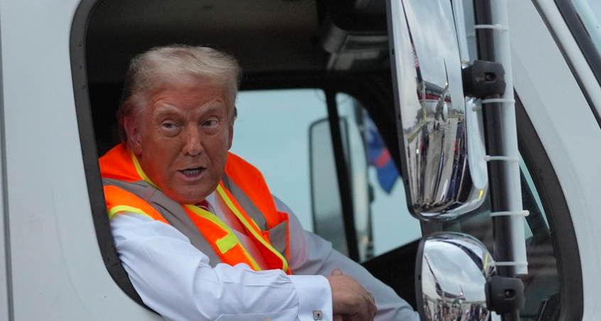 “你们觉得我的垃圾车怎么样?”特朗普坐在副驾驶位置上询问记者。“这辆垃圾车是为了向哈里斯和拜登致敬。”