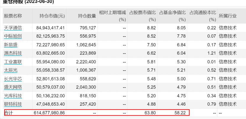 具体而言,诺德新生活二季度末的权益类仓位为80.90%,较一季度末的86.53%下降5.63个百分点,其前十大重仓股合计仓位近6成,且全数为信息技术板块的公司,依次为:天孚通信、中际旭创、新易盛、源杰科技、工业富联、太辰光、长光华芯、盛天网络、光库科技、联特科技。
