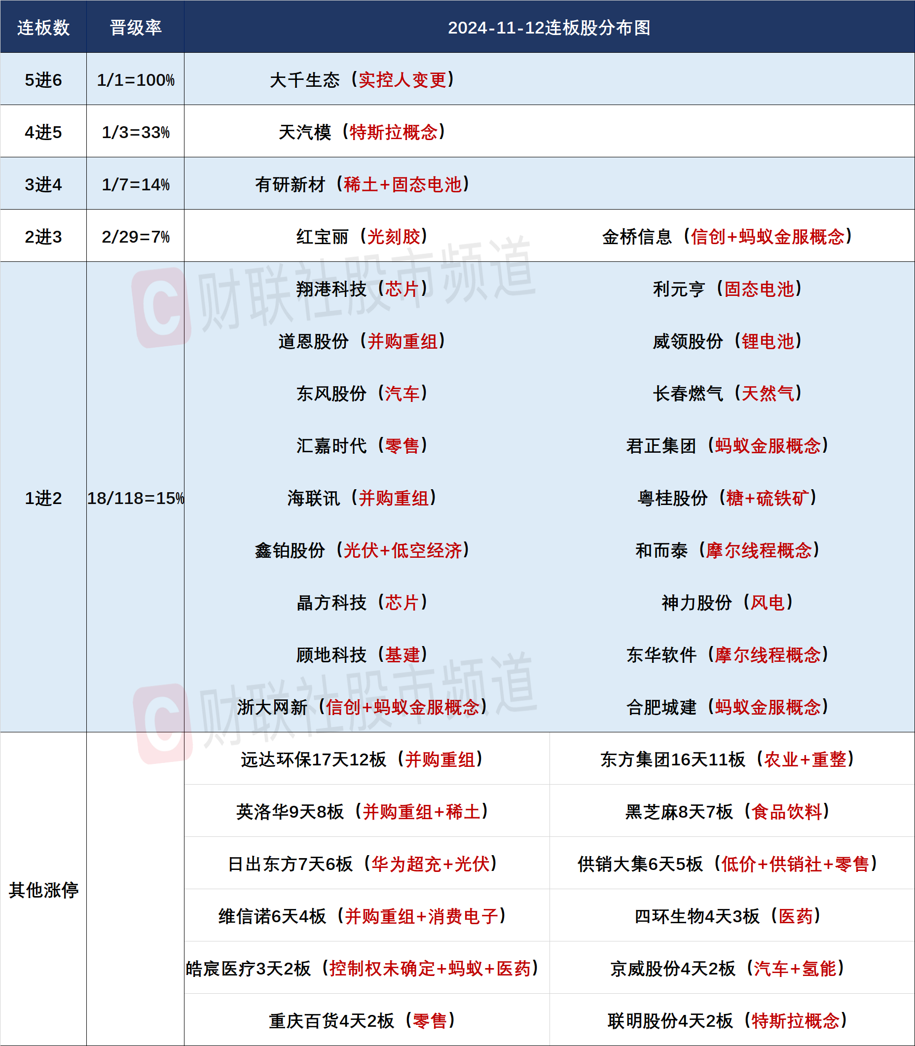 4、数据显示,以首次披露日期为口径统计,截至11月10日,2024年以来已有104家上市公司推出资产重组计划。并购重组概念近期表现有所分化,前期人气龙头双成药业二连跌停仍对板块影响巨大,光智科技、阳谷华泰、富乐德等并购半导体资产品种受限于其市值体量过大,后续预期空间有限而纷纷占据跌幅前列。而被打造为国家电投集团水电资产平台的远达环保由于目前其总市值也仅有不到130亿,使得该股今日再度走出反包板晋级。增发吸收合并杭汽轮B的杭州国资股海联讯复牌后连续两日一字涨停,拟向中电智算增发收购算力资产的城地香江也展开低位修复。与此前的无差别爆炒不同的是,目前并购重组线的炒作更聚焦于具体个股的自身估值和基本面状况,选股难度也远高于此前普涨行情。