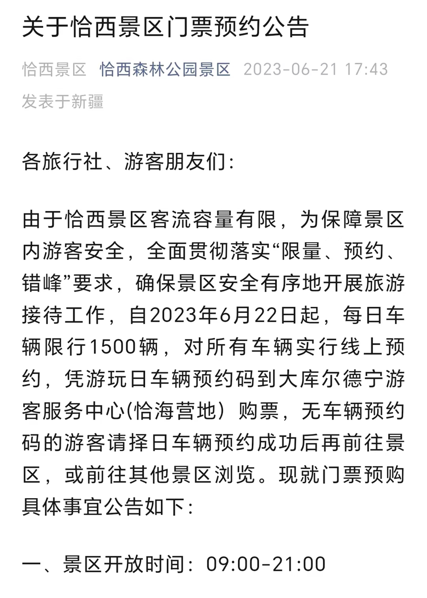 6月21日,地处伊犁州巩留县的恰西国家森林公园景区发出通知,景区将于今年6月22日起实行车辆限流,每天车辆限行1500辆,且所有车辆均需线上预约前往。