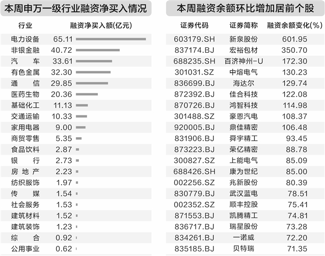 融资客继续加仓A股,全周融资净买入逾187亿元,连续11周净买入超百亿元,融资余额达2.26万亿元,创历史新高。电力设备行业本周获得逾65亿元融资净买入,非银金融行业获得逾40亿元净买入,汽车行业、有色金属行业均获得逾30亿元净买入,通信行业、医药生物行业也都获得超20亿元净买入。电子行业、计算机行业都遭融资净卖出逾33亿元,国防军工行业净卖出逾19亿元。