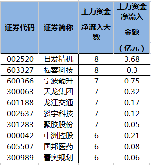 主力资金连续5日以上净流入日发精机等26股