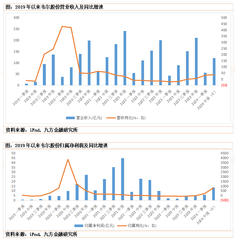 7月5日晚,韦尔股份发布中报预告,预计2024年半年度实现营业收入为1,190,380.89万元到1,218,380.89万元,与上年同期相比,将增加304,534.80万元到332,534.80万元,同比增加34.38%到37.54%。预计2024年半年度实现归属于母公司所有者的净利润为130,779.21万元到140,779.21万元,同比增加754.11%到819.42%;公司预计2024年半年度实现归属于母公司所有者的扣除非经常性损益的净利润为131,798.22万元到141,798.22万元,同比增加1769.15%到1895.79%。
