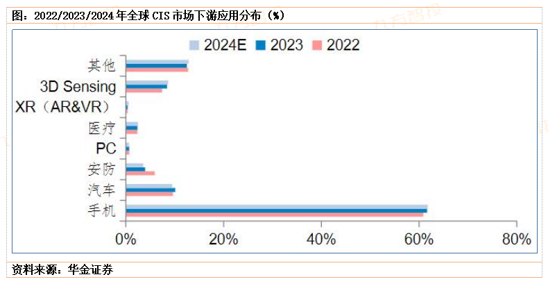 Sigmaintell数据显示,手机为CIS第一大应用领域,预计2024年占比为62%;汽车为CIS第二大应用领域,预计2024年占比为9.49%;医疗和XR市场增速较快,2024年市场规模有望同比增长18.4%和65.8%。