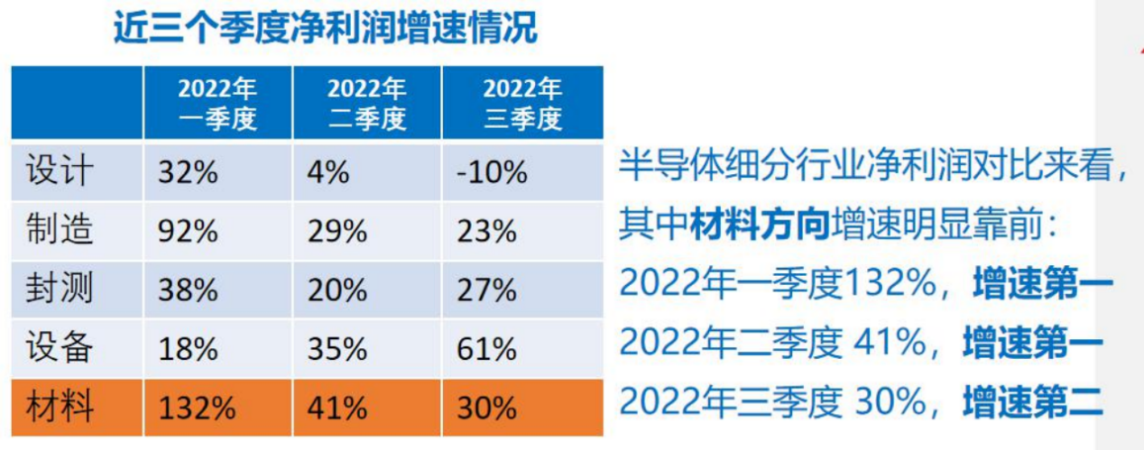 在所有半导体产业当中,其行业景气度也是有明显区别,今天重点关注其中的景气度最高的半导体材料方向,从最近三个季度细分行业净利润增速来看,半导体材料连续两个季度位居第一。