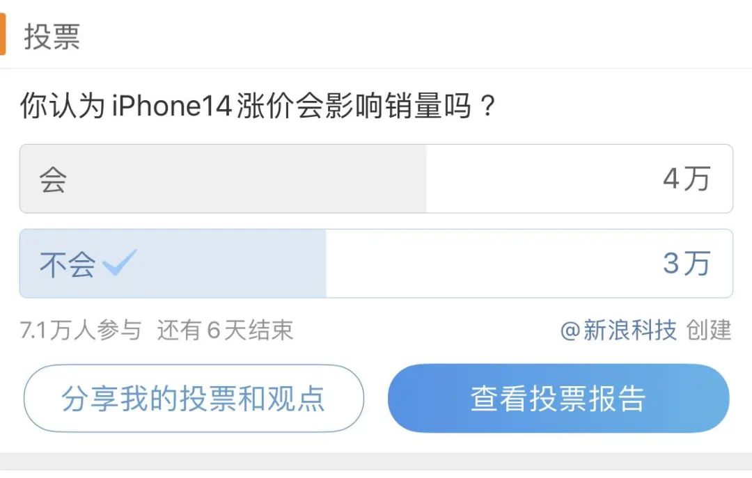 对此,有网友表示,因最近处于618电商节期间,各品牌都在大力促销拼销量,因此消息称iPhone14涨价可能是为了拉动iPhone13销量。也有网友认为,因为iPhone14发布期临近,市场传出iPhone14将涨价的消息,或为品牌方提前试探消费者对新品价格的接受度和敏感度。近日,新浪科技发起了一项你认为iPhone14涨价会影响销量的调研,截至记者发稿,已有7.1万网友参与,其中约4万网友认为会影响销量,约3万网友认为不会影响销量。