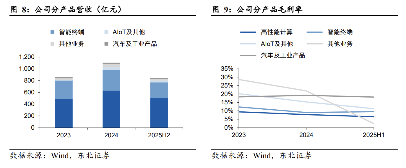 汽车及工业产品:公司的战略新兴业务,2025年前三季度收入占比1.4%,但同比增长77%。目前已在智能座舱、智驾域控等领域取得突破,并获得多家车企定点,预计2025年收入将首次突破10亿元。