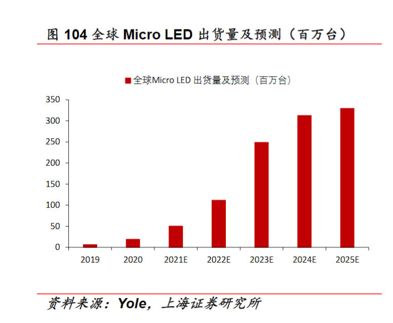 研发力度加大将推动Micro LED成本降低,目前,LED显示屏价格平均每年下滑20%-30%。根据Yole数据显示,2020年全球Micro LED产品出货量为1890万台,预计2025年将达到3.3亿台。