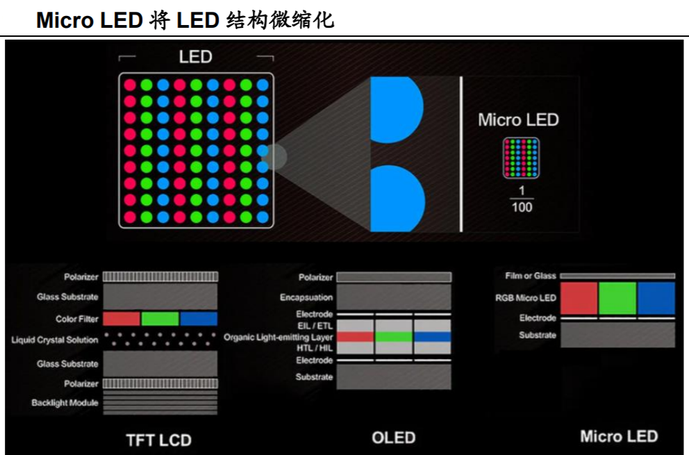 据悉,Micro LED是将传统LED结构进行矩阵化、微缩化,尺寸缩小至1~10μm,通过巨量转移将固晶转移到基板上后,再利用物理沉积完成保护层和电极,最后封装而成的。
