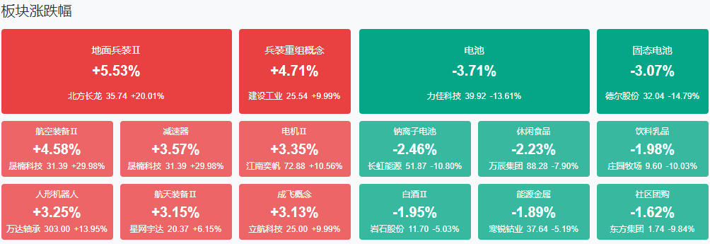 板块方面,人形机器人、军工、医疗信息化、环保设备等板块涨幅居前,固态电池、白酒、房地产、零售等板块跌幅居前。截至收盘,沪指跌0.01%,深成指跌0.15%,创业板指跌0.94%。