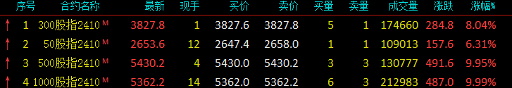 截至9月27日收盘,沪深300股指期货(IF)、上证50股指期货(IH)、中证500股指期货和中证1000股指期货主力合约分别上涨8.04%、6.31%、9.95%和9.99%。IC和IM的部分远月合约封住涨停板收盘。