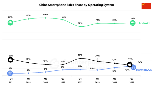 2023年起,华为HarmonyOS市场份额呈上升趋势。根据Counterpoint,华为HarmonyOs系统的份额呈现出快速上升趋势,截至2023年三季度,华为HarmonyOS系统在中国的市场份额已经达到13%,为安卓、iOS之后的第三大手机操作系统,在全球市场的份额也达到3%。