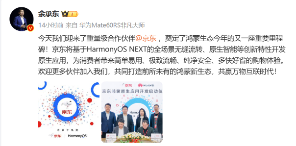 1月10日晚间,华为常务董事、终端业务CEO、智能汽车解决方案BU董事长余承东在社交平台“官宣”合作京东:“今天我们迎来了重量级合作伙伴京东,奠定了鸿蒙生态今年的又一座重要里程碑!”