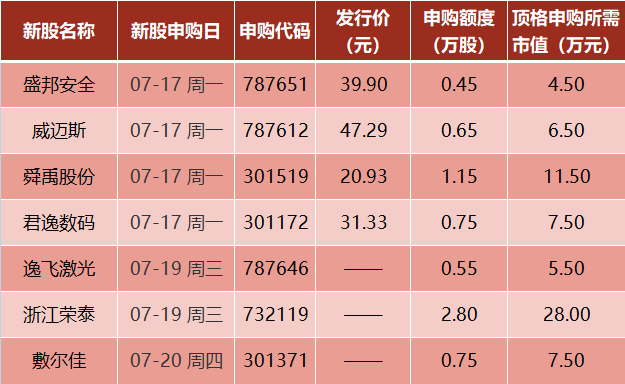 本周(7月17日~7月21日)共有7只新股发行。具体来看,周一4只:盛邦安全、威迈斯、舜禹股份、君逸数码;周三2只:逸飞激光、浙江荣泰;周四1只:敷尔佳。
