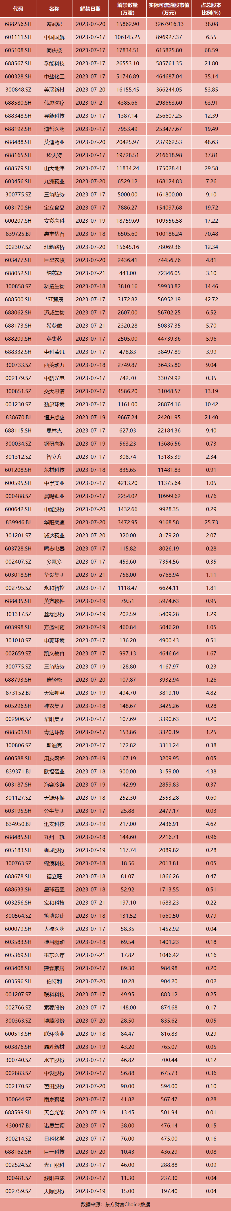 数据显示,本周(7月17日~7月21日)共有90家公司限售股陆续解禁,合计解禁量42.02亿股,按7月14日收盘价计算,解禁市值为925.1亿元。