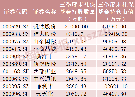 从社保基金持股数量看,截至10月21日,社保基金持仓数量最高的前三只个股分别为钒钛股份、神火股份、山金国际,持股数量分别达2.0亿股、0.83亿股、0.52亿股。