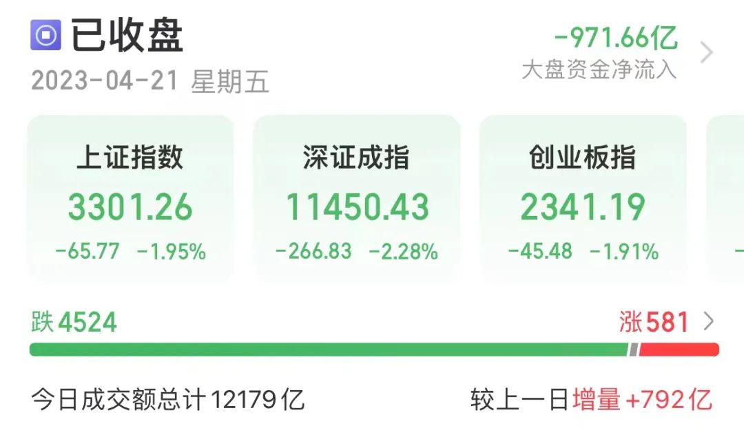 今日,A股三大股指集体收跌,沪指跌1.95%,深成指跌2.28%,创业板指跌1.91%,另外,科创50指数跌4.13%。两市合计成交12179亿元,北向资金净卖出76.19亿元。