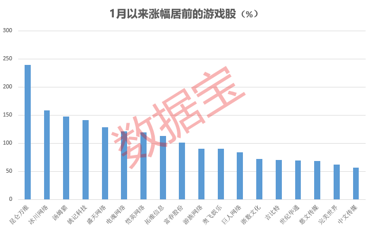 在传媒细分行业中,申万游戏行业指数涨幅高达78.14%,排名居首。今年以来,A股36只游戏概念股中,昆仑万维、冰川网络、汤姆猫、姚记科技等9股股价翻倍,其中昆仑万维以近2.4倍的涨幅,排名第一。此外,仅ST美盛、卧龙地产、盛讯达累计录得下跌。