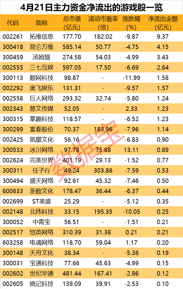 数据宝统计,今日主力资金大幅净流出游戏板块,金额合计30.88亿元。其中拓维信息、昆仑万维、汤姆猫净流出金额居前,分别为9.37亿元、4.15亿元、3.43亿元。