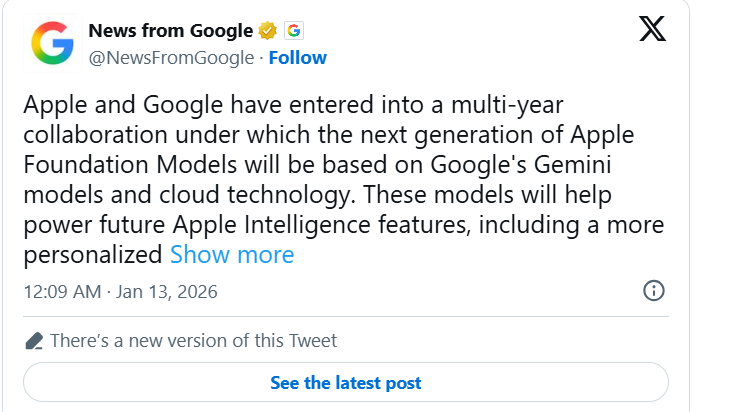 根据媒体此前1月12日援引的知情人士透露的消息,苹果公司(Apple)将在一项多年期协议下,把谷歌的 Gemini AI大模型用于今年推出的新版Siri AI语音助手,并且谷歌表示其模型也将为其他的Apple Intelligence核心功能提供技术支持;与此同时,Apple Intelligence仍会在消费电子设备端以及通过 Private Cloud Compute 运行,并强调会维持一贯的隐私标准。
