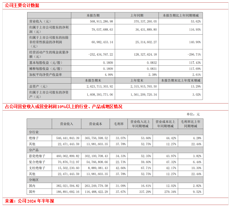 截至2024年6月底,公司在国家电网组织的2024年度集采招标中取得了2.7亿的合同订单,复合绝缘子订单同比增长479%,支柱绝缘子订单同比增长74.3%。