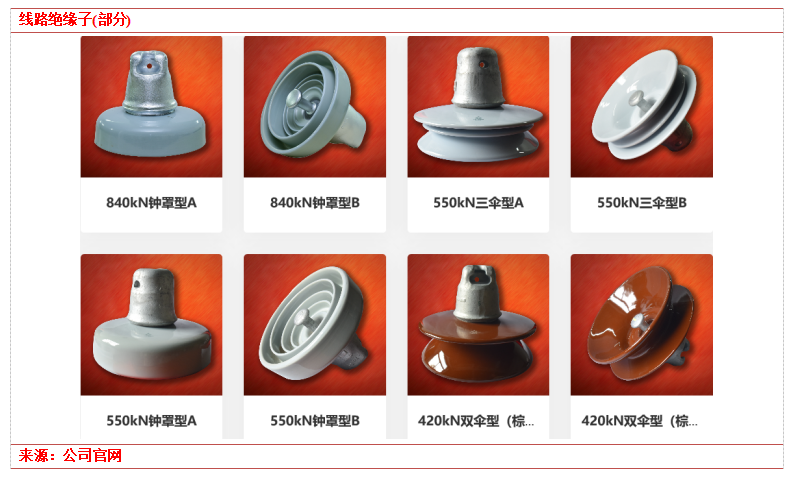 公司主要产品包括70~840kN交(直)流悬式瓷绝缘子、10~1000kV交流复合绝缘子、±500~±1100kV直流复合绝缘子、10kV~1000kV电站用支柱绝缘子/高压瓷套及各种电瓷金具等。