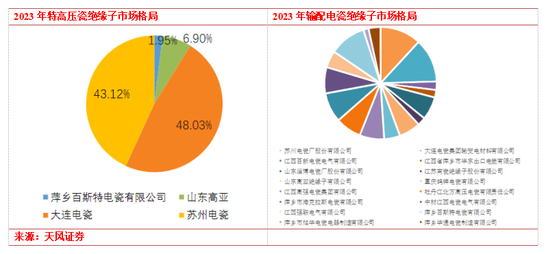 相较来看,输配电领域瓷绝缘子的参与企业数量明显高于特高压,市场竞争更为激烈。以2023年国网招标的输配电线路为统计区间,大连电瓷市占率约为12.92%,其次是苏州电瓷(12.08%)和江西百斯特(8.69%)。