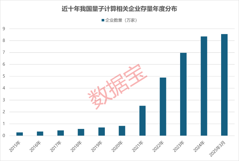 企查查数据显示,我国量子计算相关企业存量从2015年末的0.27万家逐年稳定增加,至2020年末达0.83万家;2021年开始,我国量子计算相关企业存量呈现指数级跃增,分别于2021年、2023年跨越2万家、5万家门槛。截至2025年3月4日,我国现存8.56万家量子计算相关企业,较2020年增长超10倍。