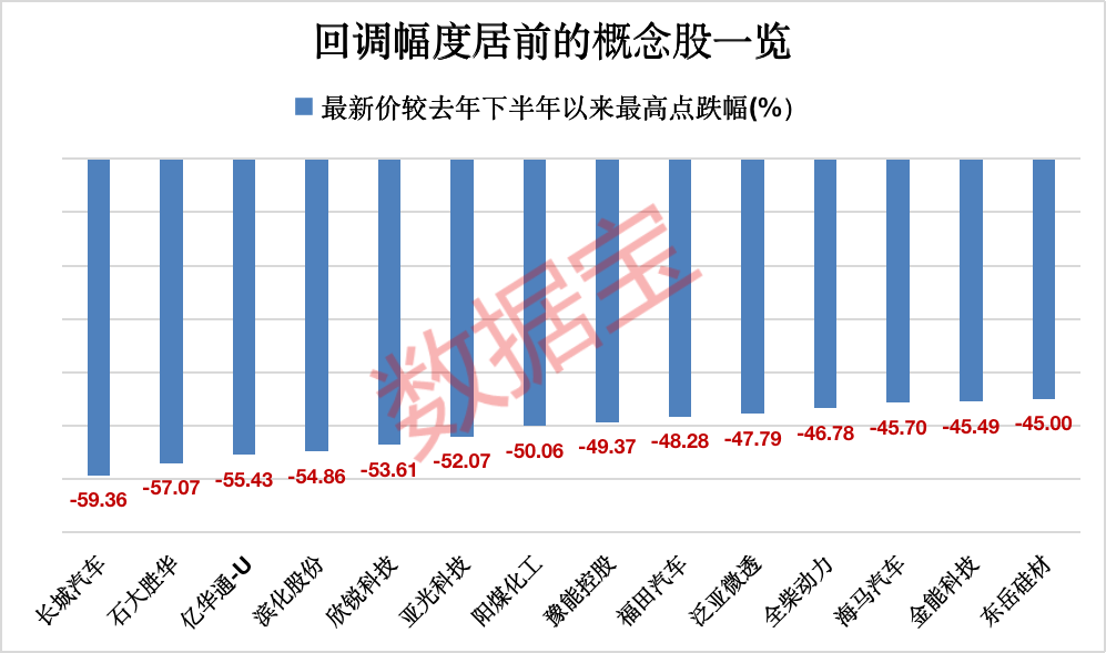 燃料电池和氢能板块从去年12月左右开始自高点回调,上述65只概念股的股价自去年下半年以来的高点平均回调36.84%,其中28股回调幅度超40%,长城汽车、石大胜华、亿华通-U、滨化股份等7股的回调幅度均超50%。