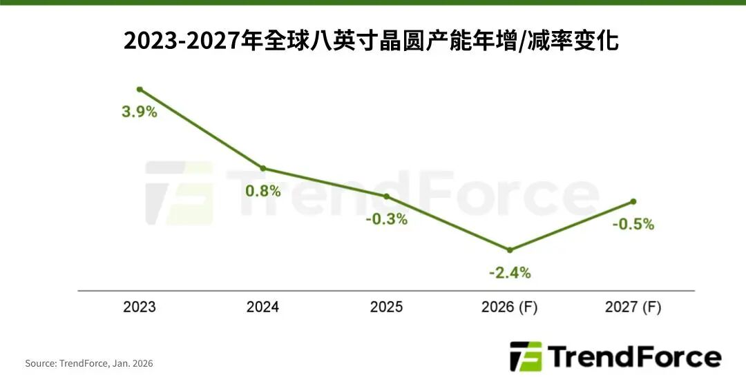 在供给方面,TSMC已于2025年正式开始逐步减少八英寸产能,目标于2027年部分厂区全面停产。Samsung同样于2025年启动八英寸减产,态度更加积极。TrendForce集邦咨询预期,2025年全球八英寸产能将因此年减约0.3%,正式进入负成长局面。2026年尽管SMIC(中芯国际)、Vanguard(世界先进)等计划小幅扩产,仍不及两大厂减产幅度,预估产能年减程度将扩大至2.4%。