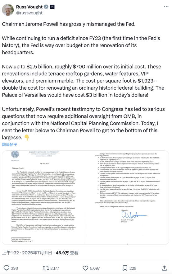 “虽然自23财年以来一直处于赤字状态(这是美联储历史上首次),但其总部大楼的翻修工程却远远超出了预算。” 沃特在社交媒体网站X上写道。