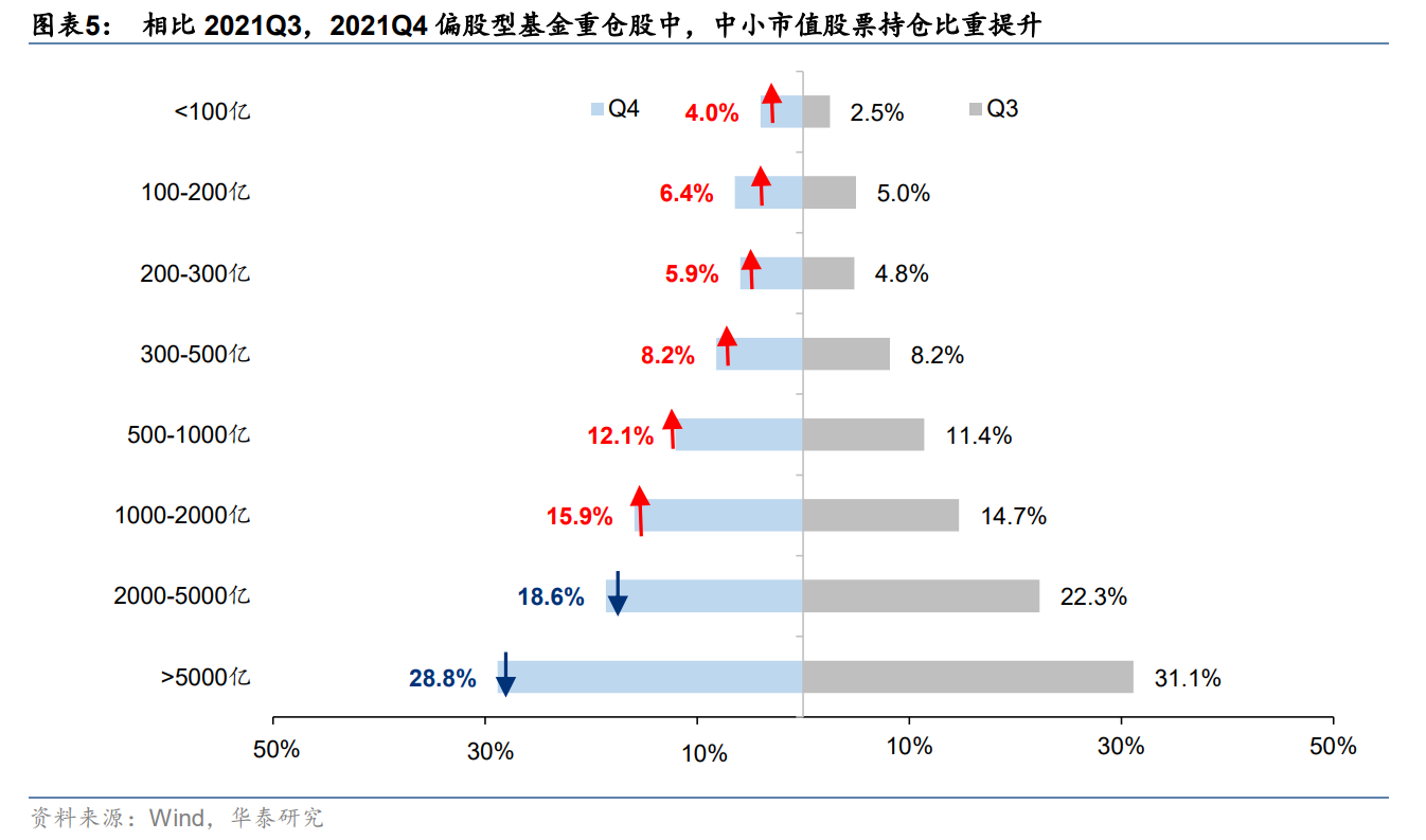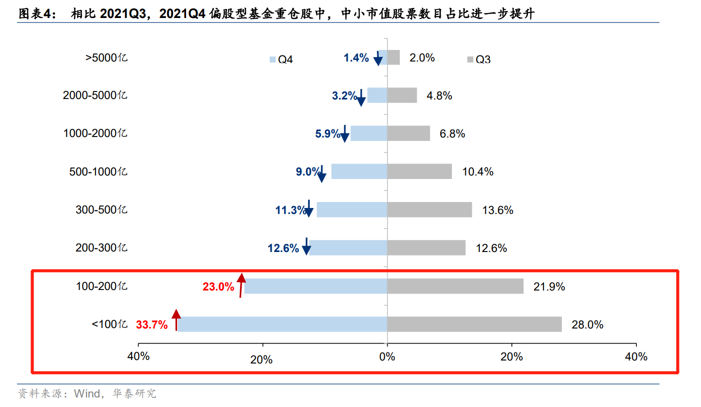 从全部重仓股市值大小的分布来看,相比三季度,四季度小市值股票的数量占比加速提升,中小市值股票的持仓占比进一步提升