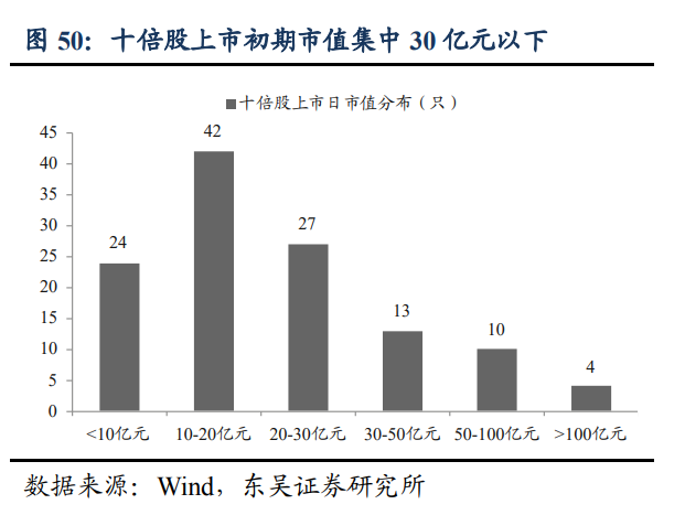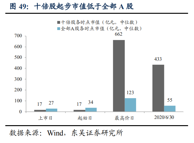 十倍股大多是小市值起步,十倍股上市日市值中位数17亿元,低于全部A股的27亿元,30亿元以下占比达到78%。十倍股起始日(上市一年后)市值中位数17亿元,同样低于全部A股34亿元。起步低市值给了更大增长空间,在股价最高价日,十倍股市值中位数662亿元,远超全部A股123亿元。截至目前(2020/6/30,下同),十倍股的市值中位数433亿元,是全部A股(55亿元)的近8倍。