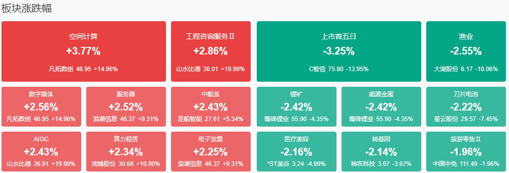 板块方面,算力租赁、CPO、东数西算、建筑装饰等板块涨幅居前,草甘膦、食品加工、养殖、小金属等板块跌幅居前。