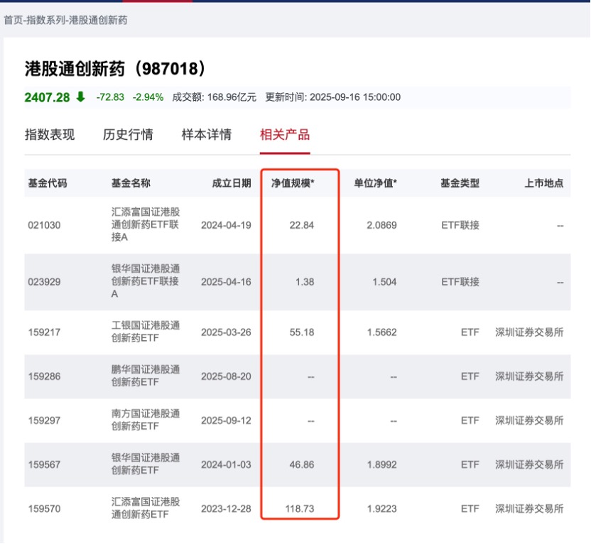 此外,鹏华国证港股通创新药ETF在8月20日刚刚上市,最新规模5.56亿元,南方基金旗下国证港股通创新药ETF于9月12日刚刚上市,募集规模为3.35亿元。