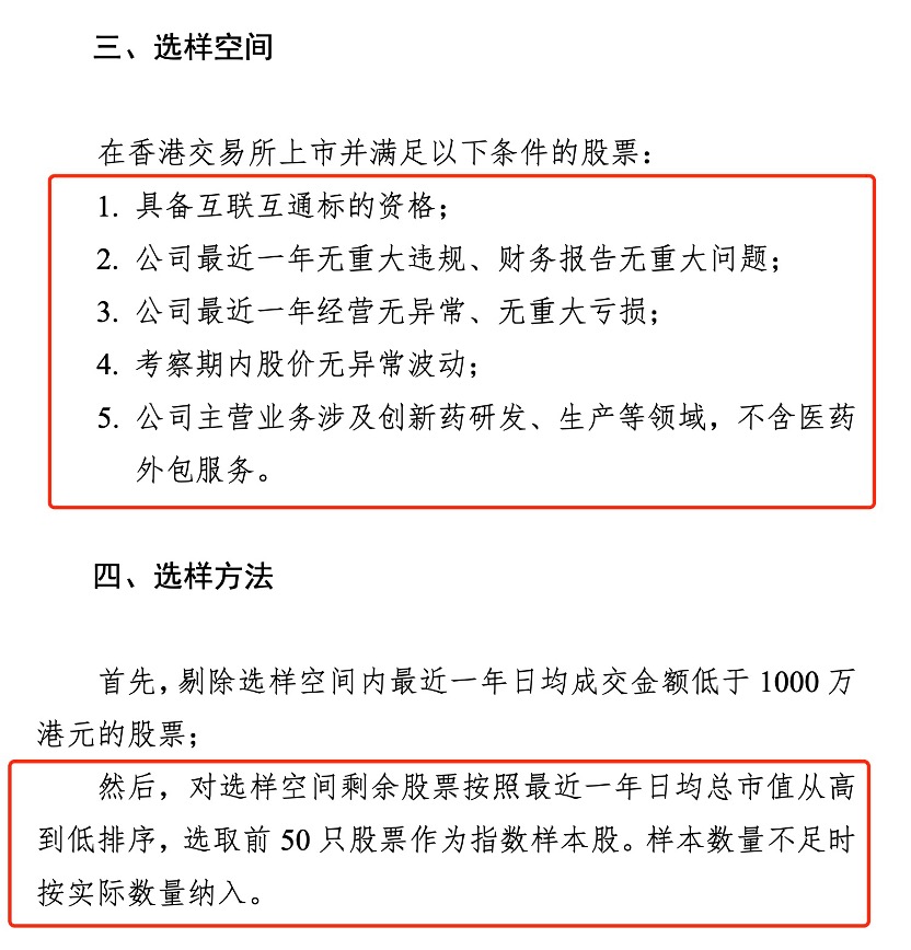 此外,选样上,剔除选样空间内最近一年日均成交金额低于1000万港元的股票;对选样空间剩余股票按照最近一年日均总市值从高到低排序,选取前50只股票作为指数样本股。样本数量不足时按实际数量纳入。