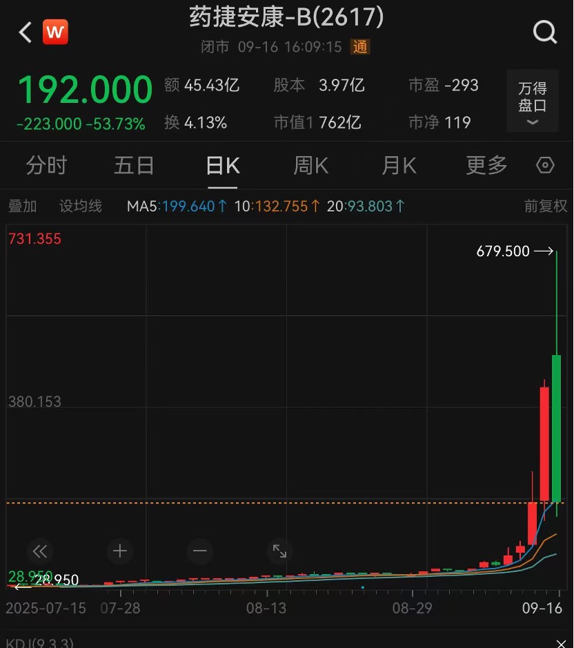 9月16日,港股创新药上市公司药捷安康-B高开高走,涨幅一度涨至63.73%,随后到了下午上演高台跳水,最高跌幅甚至达到63.73%,一涨一跌,两个相同的数据,让投资者感受到天壤之别的差距,截至收盘,药捷安康收跌53.73%,市值为762亿港元。