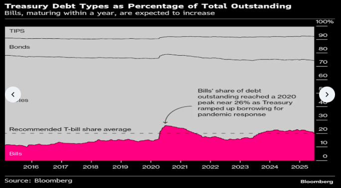 此次再融资公告,还可能包含有关贝森特准备允许未偿还短期国库券占美国债务总额的比例增长多少的指引。