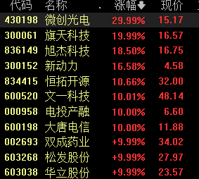 10月25日,并购重组概念股开盘活跃,截至发稿,微创光电30%涨停,旗天科技20%涨停,旭杰科技、新动力、恒源开拓等多股大涨,文一科技、电投产融、大唐电信等多股涨停。