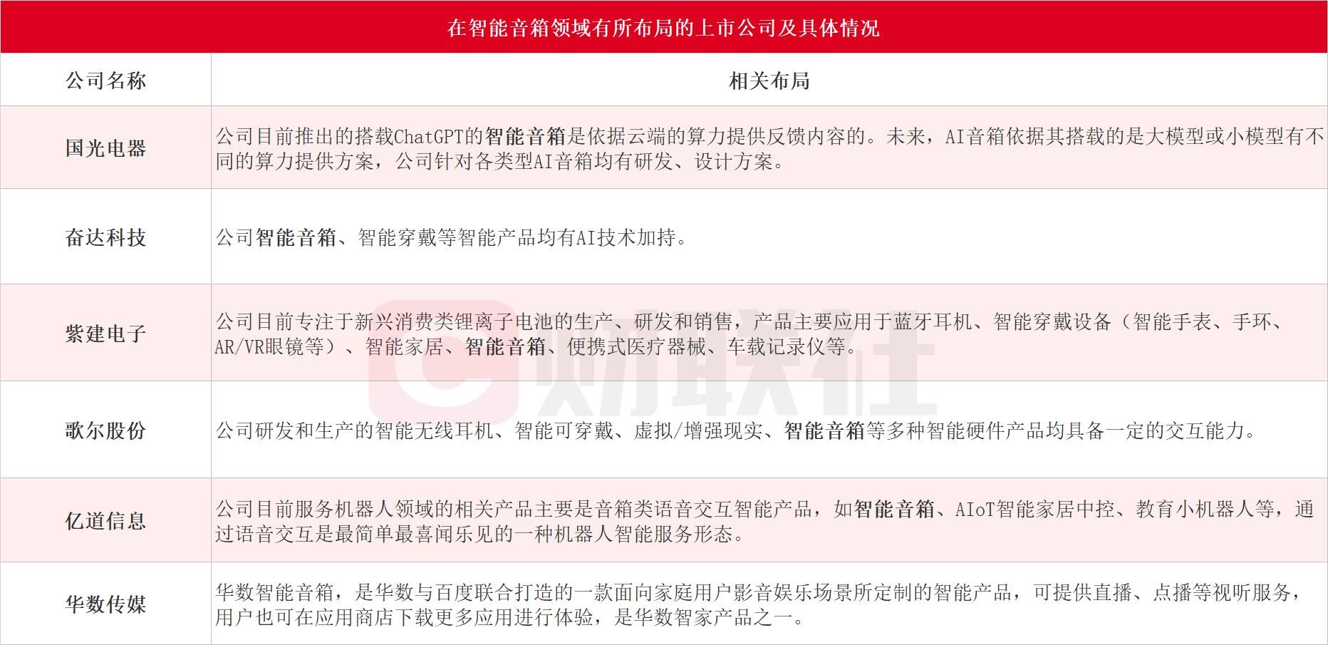 据财联社不完全统计,在智能音箱领域有所布局的A股上市公司包括国光电器、奋达科技、紫建电子、歌尔股份、亿道信息和华数传媒等,具体情况如下: