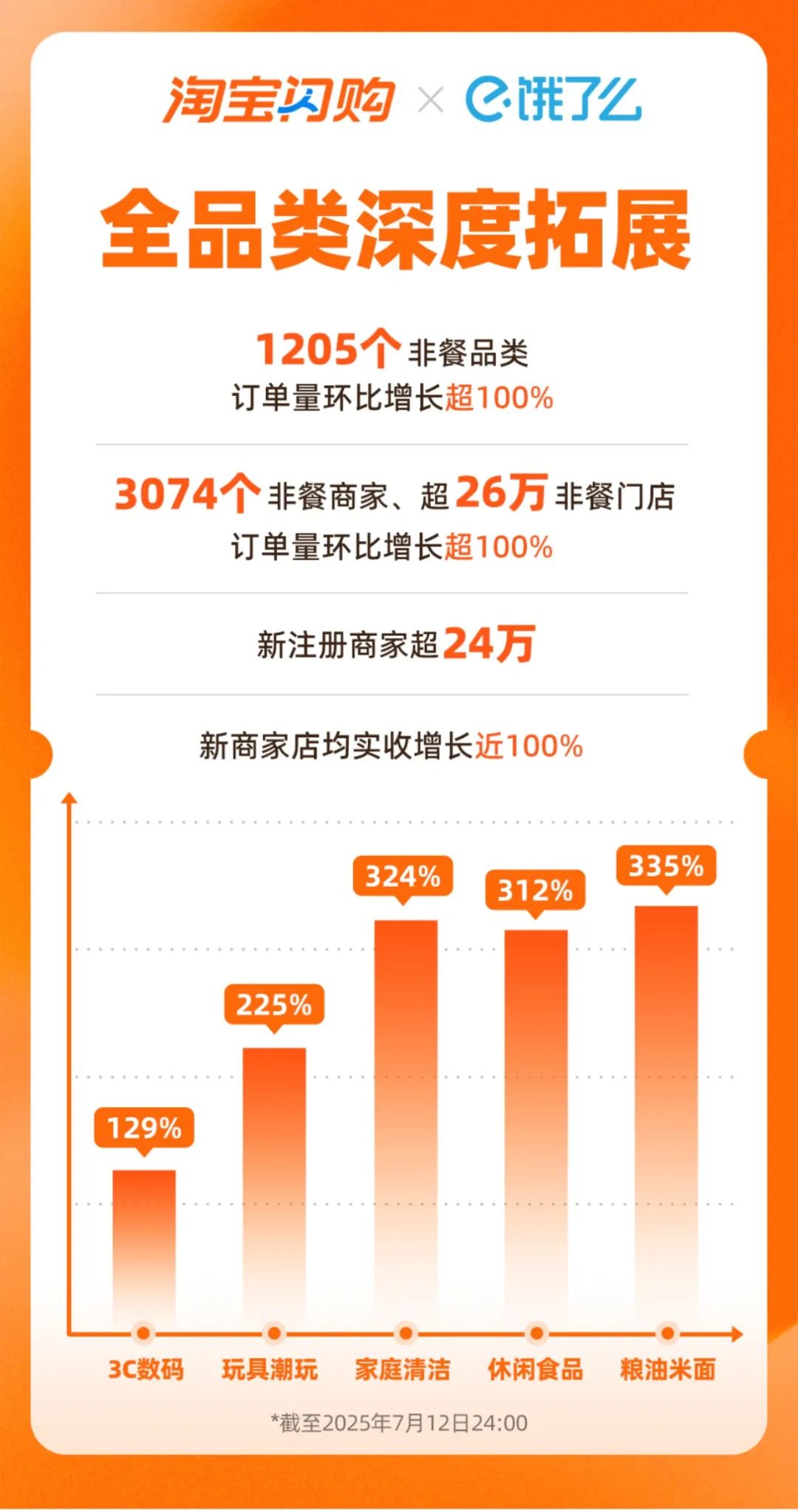 7月14日,淘宝闪购联合饿了么宣布,日订单量再次突破8000万创新高(不含自提及0元购)。淘宝闪购日活跃用户数在突破2亿基础上,周环比净增15%。据介绍,在非餐方面,1205个品类订单量环比增速超过100%;3074个商家、超26万门店订单量环比增长超100%。自淘宝闪购上线以来,新注册商家超过24万。